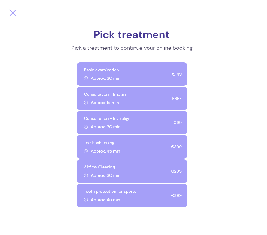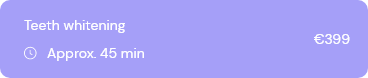 Should you wish to include pricing information for treatments within your online booking system, we are able to facilitate this. The pricing format will reflect the example provided in the image below, with currency automatically adjusted according to the country in which your clinic operates. Kindly inform us (on support@dentli.io) of the specific prices you would like displayed, along with the corresponding treatments to which each price applies.