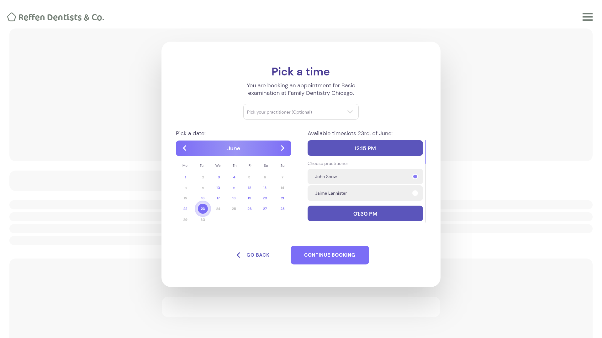 The embedded widget loads immediately and is always shown on the page. It integrates into the design and takes the user through the full booking process. Including collection of info on new patients.